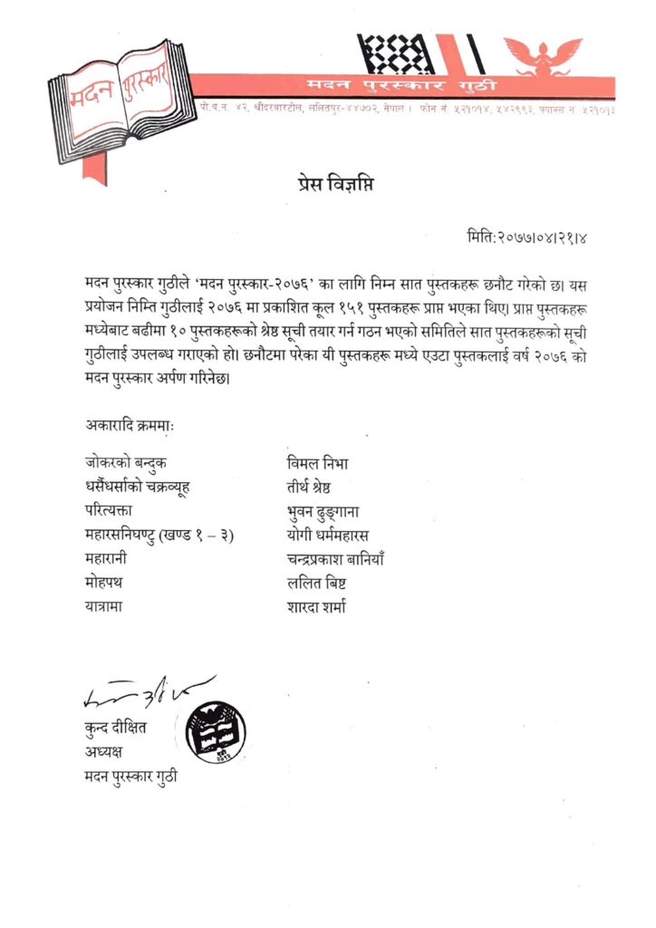 मदन पुरस्कार गुठीले वर्ष २०७६ को मदन पुरस्कारका लागि सात पुस्तकको सूची सार्वजनिक गरेको छ । गुठीले वर्षभरि प्रकाशित भएका १ सय ५१ पुस्तकबाट सात पुस्तकलाई सार्वजनिक गरेको हो । यस वर्ष ३० को दशकमा लेखन सुरु गरेका लेखकदेखि पछिल्लो पाँच वर्षयताका युवा लेखकसम्म सूचीमा समावेश छन् ।