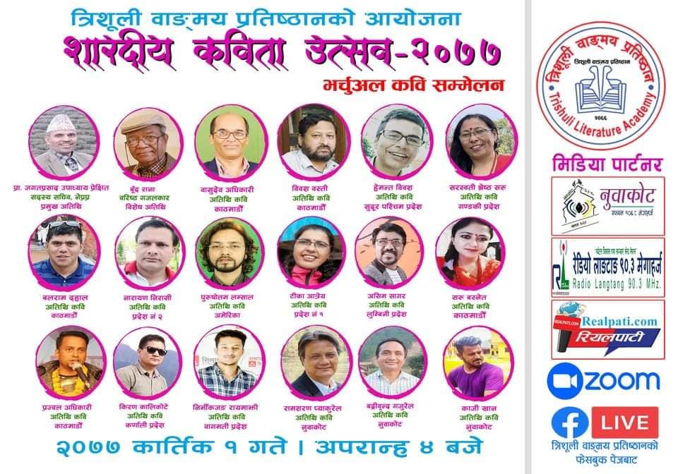 त्रिशुली वाङमय प्रतिष्ठानले प्रत्येक घटस्थापनाको दिन आयोजना गर्ने ‘शारदीय कविता उत्सव’ यो वर्ष घरबाटै मनाइएको छ । अर्थात भर्चुअल विधिबाट काव्य गोष्ठी गरी कविता उत्सव मनाइएको हो ।