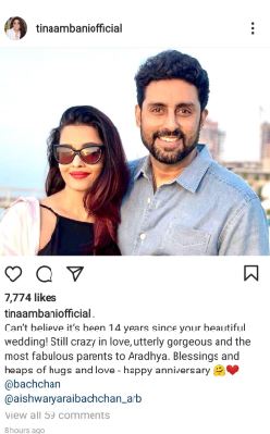 टीनाले अभिषेक र ऐश्वर्याको तस्वीर इन्स्टाग्राममा राखेर लेखिन्, ‘मलाई विश्वास नै लाग्दैन कि तिमिहरुको विवाह भएको १४ वर्ष बितिसकेको छ । अझै पनि तिमिहरु दुबै एकअर्काको मायामा निकै डुबेका छौ ।’