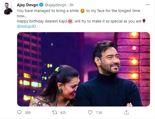 अजय देवगनले श्रीमती काजोलको साथमा एउटा फोटो सेयर गरी क्याप्सनमा लेखेका छन्, ‘लामो समयदेखी तिमीले मेरो अनुहारमा मुस्कान राख्न सफल भएकी छौ । जन्मदिनको शुभकामना प्यारी काजोल । तिमी जति विशेष छौ, हामी तिम्रो जन्मदिनलाई त्यति नै विशेष बनाउन कोसिस गर्नेछौ ।’ काजोल र अजयको विवाह २२ बर्ष अघि भएको थियो । दुबैको जोडी बलिउडको सबैभन्दा राम्रो जोडी मध्ये एक मानिन्छ ।