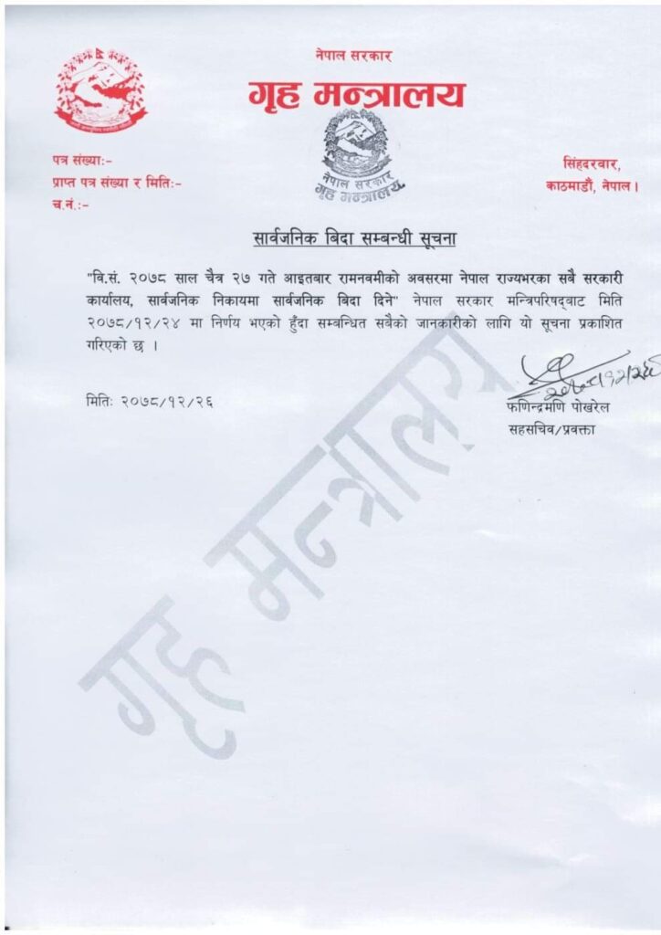 रामनवमीका अवसरमा विदा दिने निर्णय २४ चैतमा बसेको मन्त्रीपरिषद्को बैठकले गरेको जारी विज्ञप्तिमा उल्लेख छ ।