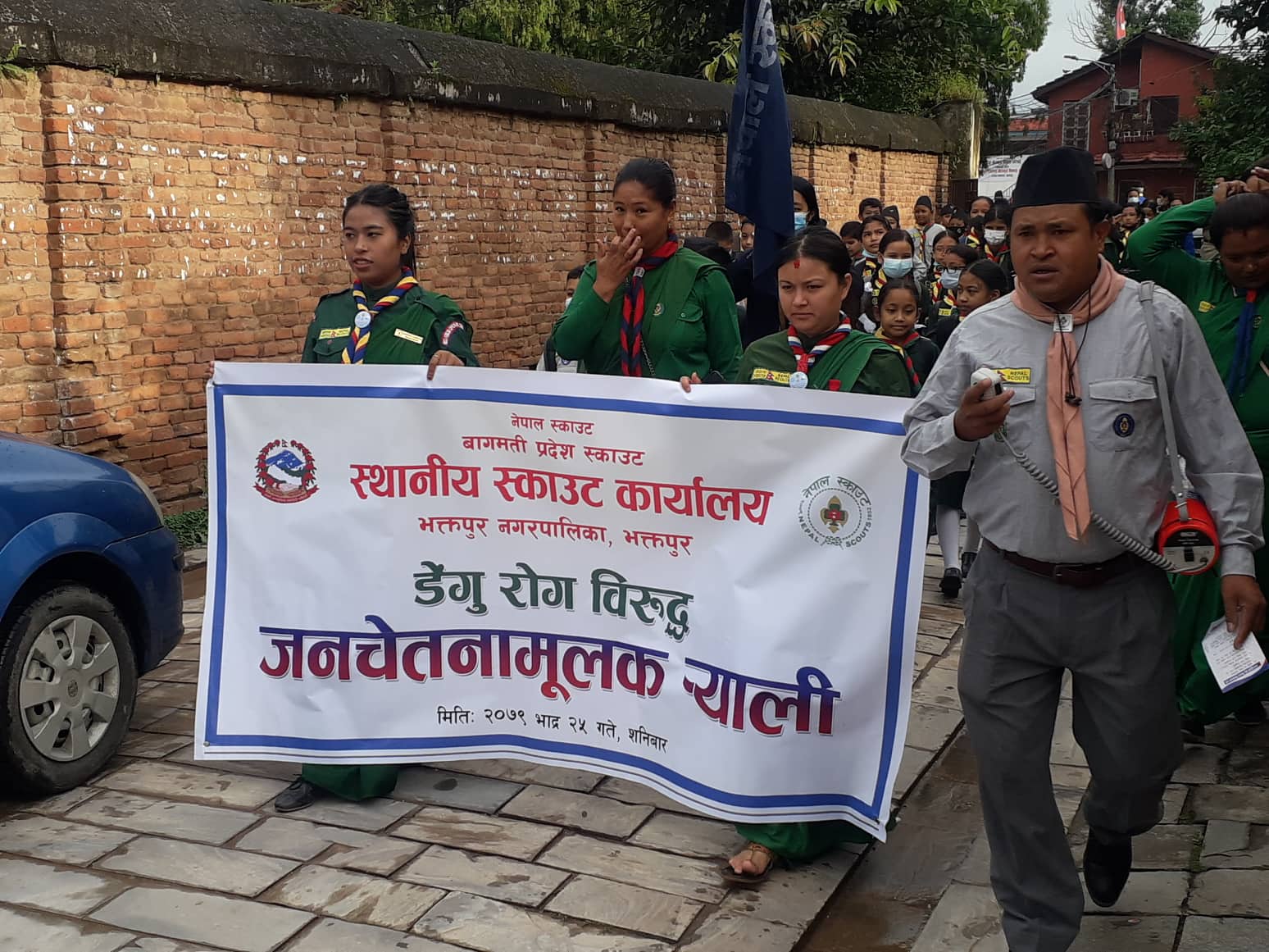 महामारीको रूपमा फैलिरहेको डेँगी रोग नियन्त्रणका लागि विभिन्न संस्थाले शनिबार भक्तपुरमा सचेतना र्याली निकालेका छन् । नेपाल स्काउट बागमती प्रदेश, भक्तपुर नगरपालिका, स्थानीय स्काउट समितिको आयोजनामा शनिबार सचेतना र्याली निकालिएको हो ।