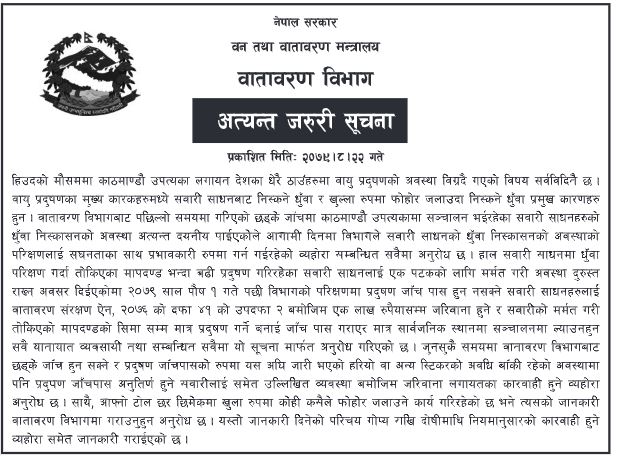 आजदेखि वातावरण संरक्षण ऐन ०७६ को दफा ४१ को उपदफा २ मा मापदण्डभन्दा धेरै धुवाँ फ्याँक्ने गाडीलाई एक लाखसम्म जरिवाना हुने विभागले सूचना जारी गरेकाे छ । सवारीसाधनको मर्मत गर्न र वायु प्रदूषण नियन्त्रण गर्न सरकारले मापदण्डभन्दा धेरै धुवाँ फ्याँक्ने गाडीमाथि कारबाहीमा पर्ने भएका छन् । विभागले वायु प्रदूषणको मुख्य कारक सवारी साधनबाट निस्केको धुवाँ रहेको जनाएको छ ।